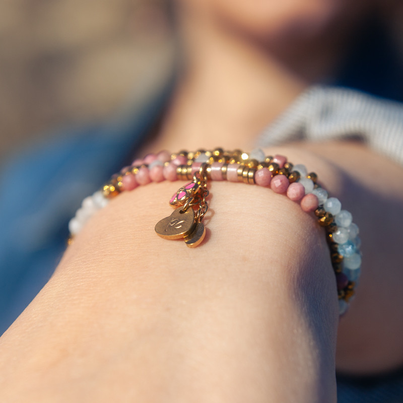 Enroulé trois fois autour du poignet, Soléa se porte comme un talisman apaisant et raffiné.