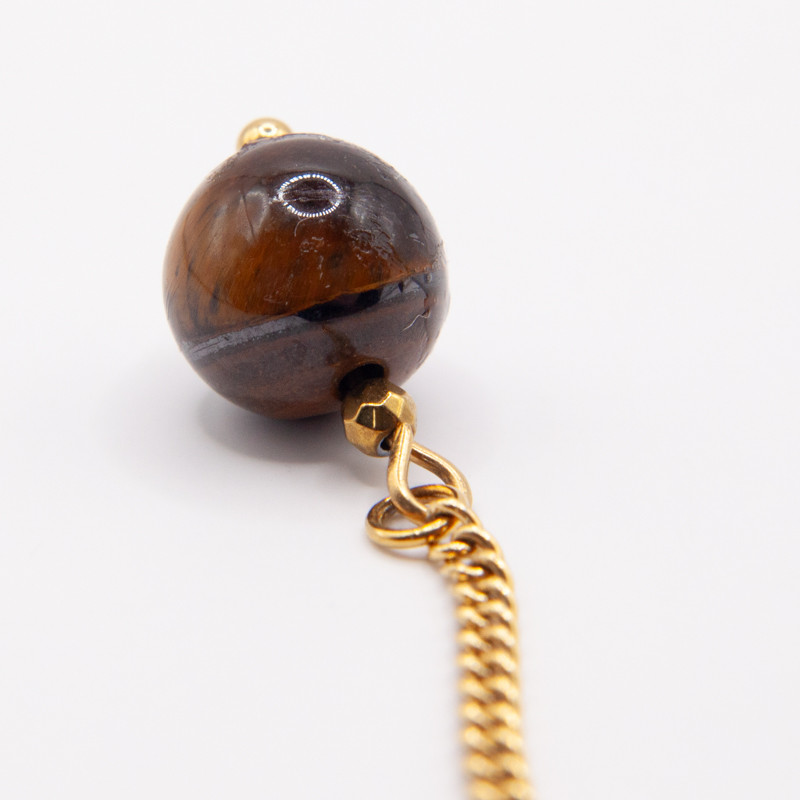 Une fine chaîne dorée laisse pendre délicatement une perle d’œil de tigre, subtilement brillante et aux reflets chaleureux.