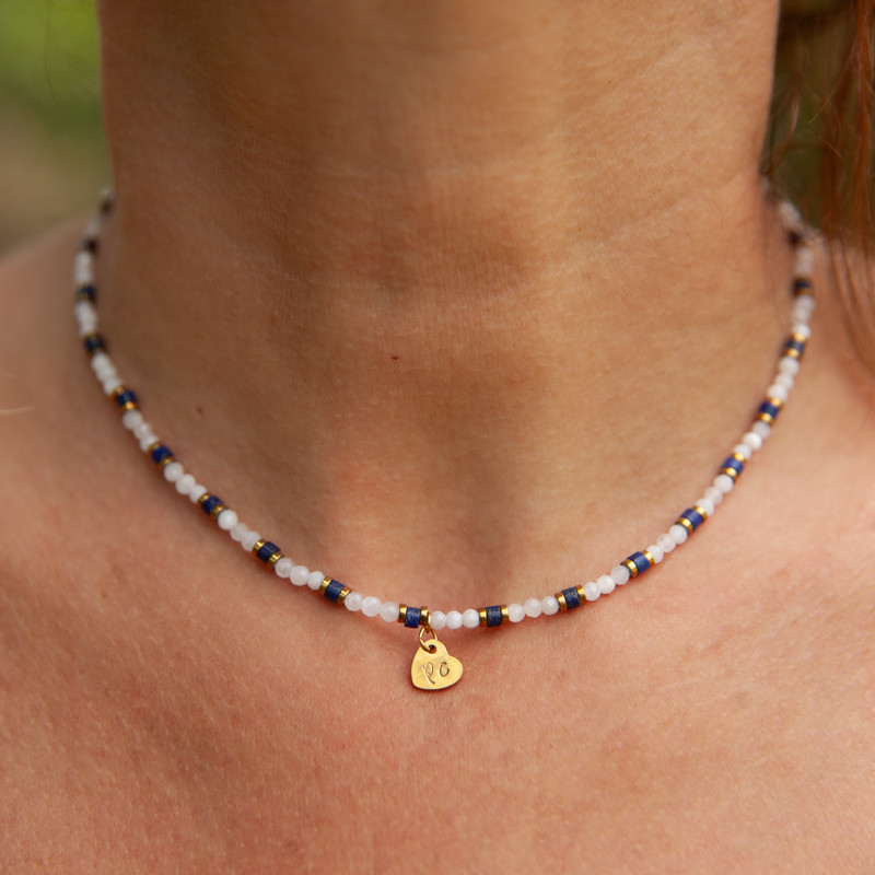Tel un souffle venu du ciel, Ciel de Lune unit la magie douce de la pierre de lune à la profondeur étoilée du lapis lazuli.